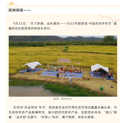 在2022年豐收節(jié)到來之際,通過開展“中國農(nóng)民豐收節(jié)”直播活動,將肥西縣域特色的農(nóng)產(chǎn)品和鄉(xiāng)村新風(fēng)貌展現(xiàn)至群眾面前,發(fā)揮活動的杠桿作用,激發(fā)了群眾對農(nóng)產(chǎn)品消費購買的熱情以及促進(jìn)肥西旅游市場的消費。此次活動共6.9萬人次參與觀看線上直播,在直播中過程中展示了肥西優(yōu)質(zhì)農(nóng)產(chǎn)品肥西老母雞、“顧公”蜂蜜、“金伶俐”瓜蔞子“好饞人”粉折、蒿子粑粑、各色水果以及美麗鄉(xiāng)村新容貌。不僅如此,該活動還受到了國家級媒體、省市縣媒體的廣泛關(guān)注,如新華網(wǎng)、中國新聞網(wǎng)安徽、合肥日報、肥西發(fā)布等媒體的紛紛報道。進(jìn)一步展現(xiàn)了肥西特色農(nóng)業(yè)及美麗鄉(xiāng)村新形象。